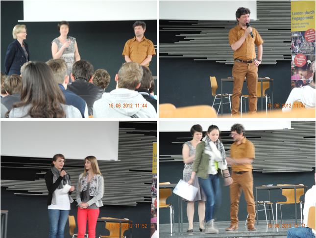 Zertifikatsübergabe: Sozailpraktikaum / Service Learning 2012Nach erfolgreichem Abschluss der Sozialpraktika nach den Prinzipien des Service Learning wurden den Schülerinnen und Schülern der 9. Klassen am 15.06.2012 die Zertifikate von Frau Frings und Herrn Breidt vom APG sowie Frau Koch-Mohné und Frau Osmainski vom Kooperationspartner IN VIA überreicht. Dabei stellten einige SuS die von ihnen an sozialen Einrichtungen durchgeführten Projekte in der Aula vor. Für das Engagement ist allen Beteiligten ein dickes Kompliment auszusprechen. (N. Breidt)